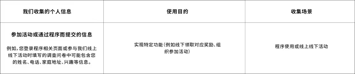 邀请您成为我们的小程序会员,汇集和核销礼品/礼券,进行用户研究分析与统计等服务。 为了让您有更好的体验、提供更好的服务或经您同意的其他用途,在符合相关法律法规的前提下,我们可能将通过上述程序中所收集的信息用于我们的会员服务。例如,将您在使用我们程序服务时的提供的信息(例如手机号码),用于自动注册“会员中心”小程序会员,并将程序过程中您赢取到的礼品/礼券自动推送至上述自动注册的“会员中心”小程序的“我的礼券”中,以便于您前往选定门店领取奖品时核销使用。还可能用于用户研究分析与统计等服务。 为了确保服务的安全,帮助我们更好地了解我们应用程序的运行情况,我们可能记录相关信息,例如,您使用应用程序的频率、故障信息、总体使用情况、性能数据以及应用程序的来源。我们不会将我们存储在分析软件中的信息与您在应用程序中提供的个人身份信息相结合。